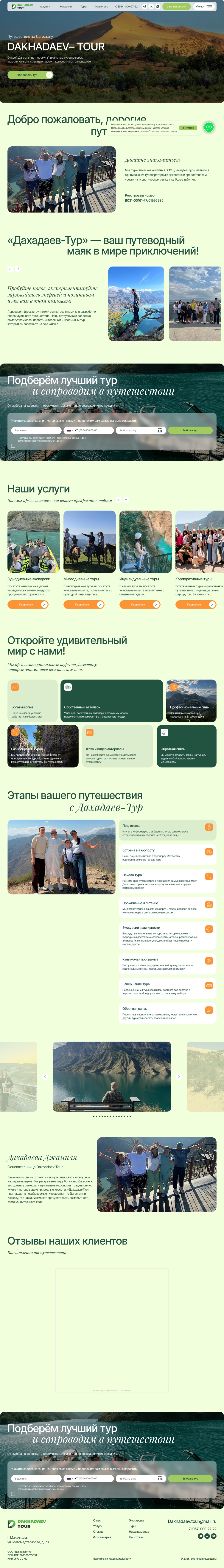 ООО «Дахадаев-Тур» — официальный туроператор в Дагестане (реестр В031-00161-77/01995985). Компании нужен был многостраничный сайт с каталогом туров, страницами экскурсий, отелем и онлайн-бронированием — чтобы передать атмосферу путешествий по горам и конвертировать посетителей в заявки. Старый сайт был устаревшим и не работал на мобильных.